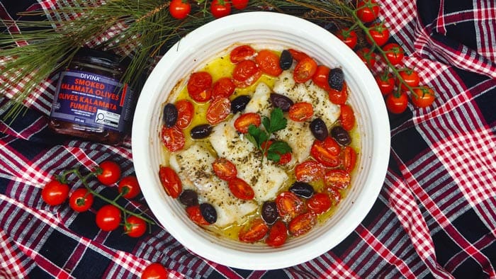 Combine oil and oregano and evenly pour over top of the fish, tomatoes and olives.